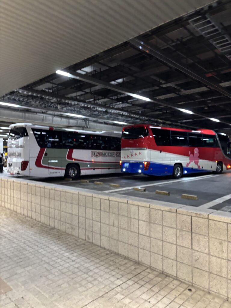 7:10 新宿駅・都庁大型バス駐車場に集合。富士山行き以外にもいろいろなバスが来ているので、間違えずにここで受け付けを済ませて搭乗します。