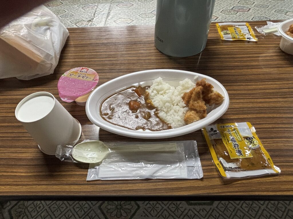 18:15 夕食はカレー。これまた何の変哲もないレトルトカレーですが、疲れ切った体に甘口のルーが染み渡ります。唐揚げが乗っているのもありがたい。福神漬けまでも染み渡りました。